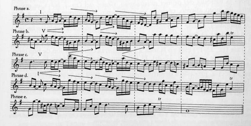 Este movimiento de la sonata Op. 1 Nº 4 de Tartini es un ejemplo de la transición entre el barroco y el style galant. Si bien la majestuosidad y seriedad son elementos barrocos, la forma en que está hecha la frase es moderna. Comienza con un motivo de cuatro notas y lo repite y combina de manera que genera todo tipo de relaciones internas cuidadosamente yuxtapuestas que genera una sensación de progresión que conduce inexorablemente a un final.